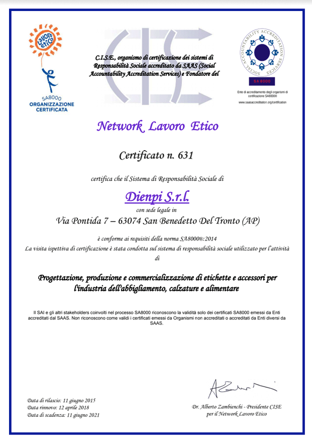 DIENPI has always naturally shared and pursued all the ethical principles that the SA8000 provides and protects, with regards to: child labour, forced labour, health and safety, freedom of association and the right to collective bargaining, discrimination, disciplinary procedures, working hours, and remuneration.